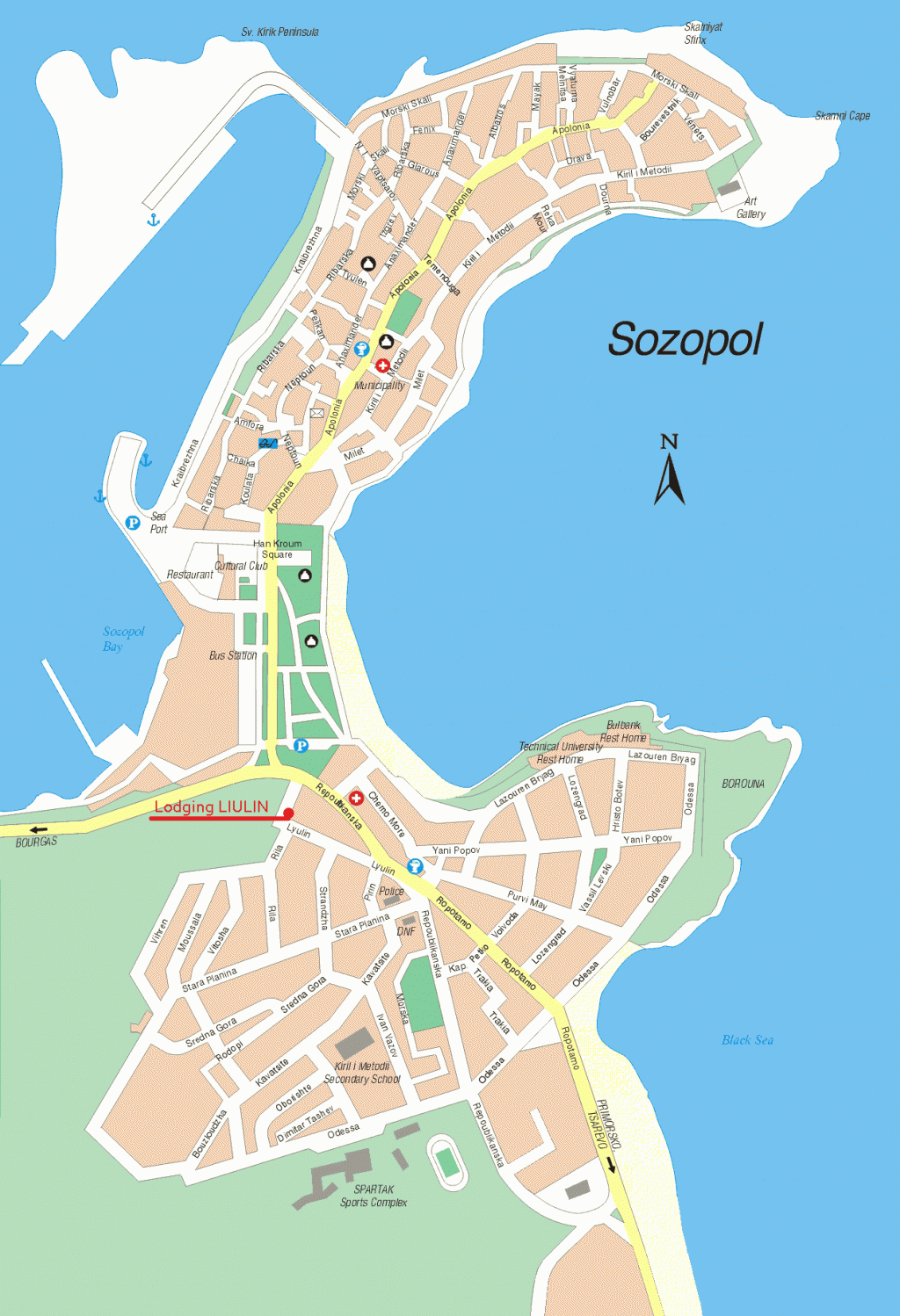 Находится в новой части города,в 200м от центра и 150м от пляжа.В