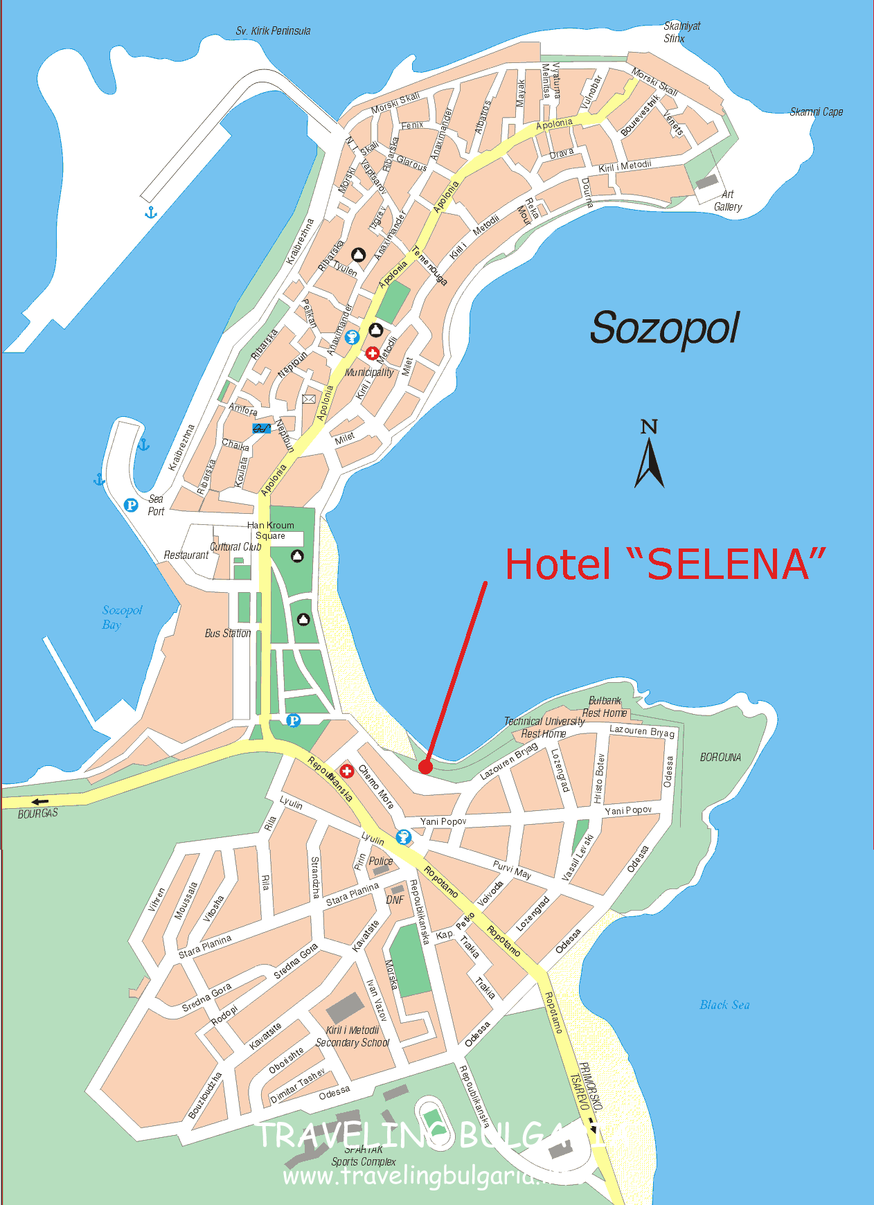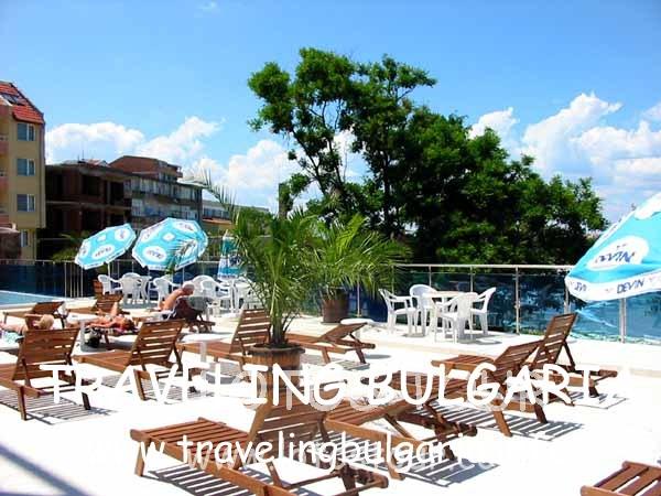 находится в Центре новой части Созополя , в 30 м от пляжа и открыт для Вас круглый год. В отеле 5 апартаментов и 55 двухместных комнат с душем , WC , верандой , телефоном , холодильником , кабельным TV, мини-баром и кондиционером. Все номера с видом на море или улицу. В отеле также есть лифт , дневной бар , ресторан с баром и террасой , панорамный бар , бассейн (в распоряжении туристов имеются зонтики и шезлонги). Предлагаются занятия по фитнесу , сауна , солярий , массаж .